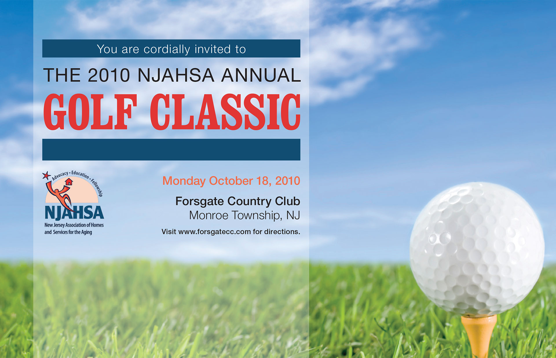 An invitation for a golf event to support an association of not-for-profit senior care organizations. The invitation was printed full color and two sided at letterhalf size.